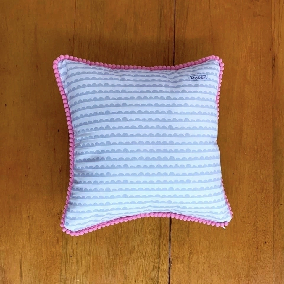 Em tecido 100% algodão, capa com zíper e acabamento de pompom.